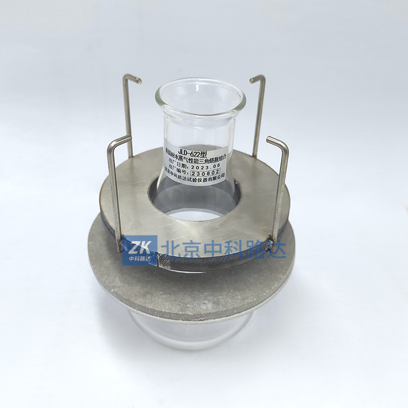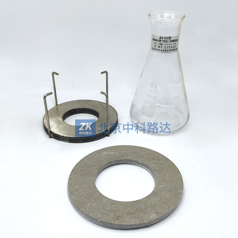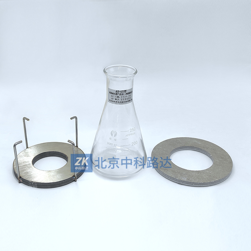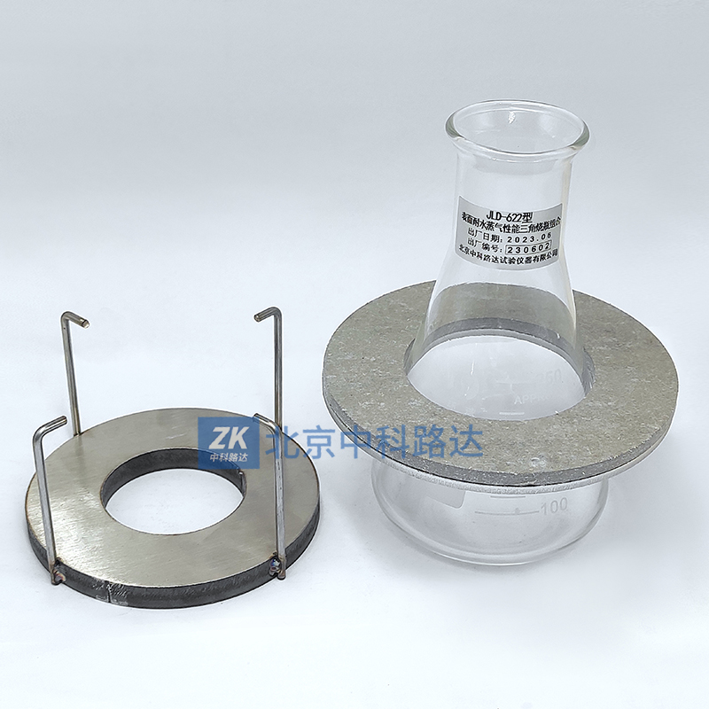 三角燒瓶組合由三角燒瓶、隔熱墊、試件架組成,用于測定飾面板材的裝飾層對沸騰水蒸氣侵蝕的抵抗能力。符合GB/T 17657-2022《人造板及飾面人造板理化性能試驗方法》中4.38 表面耐水蒸氣性能測定的標準要求。