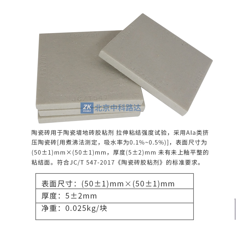 陶瓷磚用于陶瓷墻地磚膠粘劑 拉伸粘結強度試驗,采用AIa類擠壓陶瓷磚[用煮沸法測定,吸水率為0.1%~0.5%)],表面尺寸為(50±1)mm×(50±1)mm,厚度(5±2)mm 未有未上釉平整的粘結面。符合JC/T 547-2017《陶瓷磚膠粘劑》的標準要求。