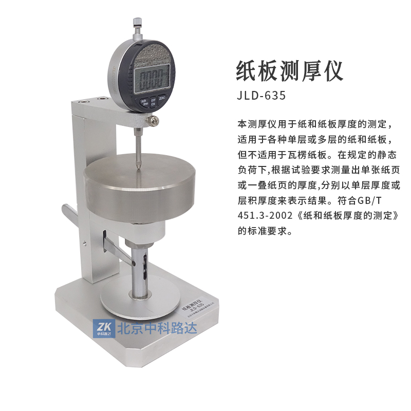 本測厚儀用于紙和紙板厚度的測定, 適用于各種單層或多層的紙和紙板,但不適用于瓦楞紙板。在規定的靜態負荷下,根據試驗要求測量出單張紙頁或一疊紙頁的厚度,分別以單層厚度或層積厚度來表示結果。符合GB/T 451.3-2002《紙和紙板厚度的測定》的標準要求。