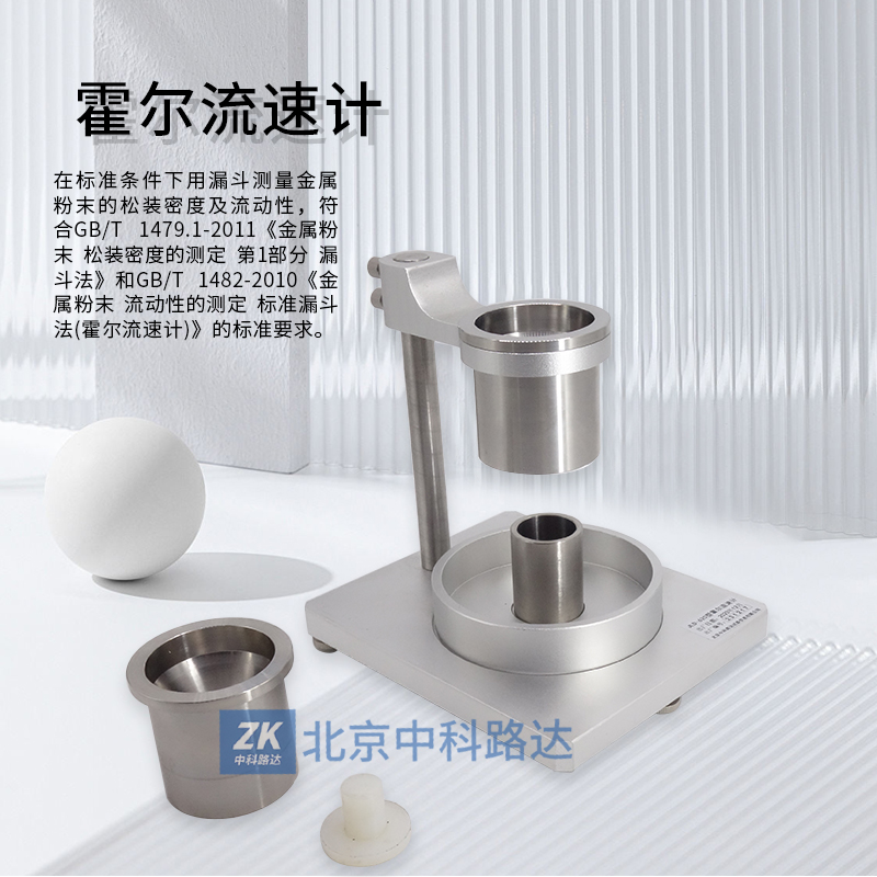 在標準條件下用漏斗測量金屬粉末的松裝密度及流動性,符合GB/T 1479.1-2011《金屬粉末 松裝密度的測定 第1部分 漏斗法》和GB/T 1482-2010《金屬粉末 流動性的測定 標準漏斗法(霍爾流速計)》的標準要求。