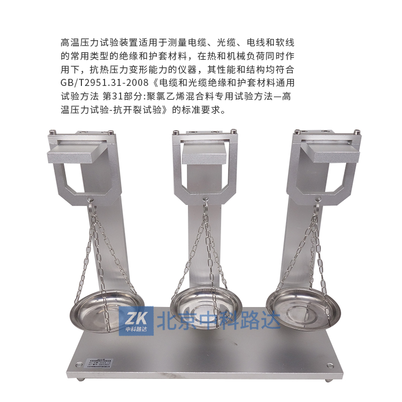 高溫壓力試驗裝置適用于測量電纜、光纜、電線和軟線的常用類型的絕緣和護套材料,在熱和機械負荷同時作用下,抗熱壓力變形能力的儀器,其性能和結構均符合GB/T2951.31-2008《電纜和光纜絕緣和護套材料通用試驗方法 第31部分:聚氯乙烯混合料專用試驗方法—高溫壓力試驗-抗開裂試驗》的標準要求。
