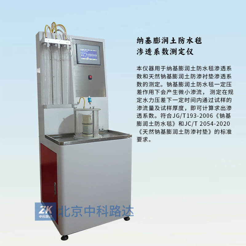 本儀器用于納基膨潤土防水毯滲透系數(shù)和天然鈉基膨潤土防滲襯墊滲透系數(shù)的測定。鈉基膨潤土防水毯一定壓差作用下會產(chǎn)生微小滲流, 測定在規(guī)定水力壓差下一定時間內(nèi)通過試樣的滲流量及試樣厚度,即可計算求出滲透系數(shù)。符合JG/T193-2006《鈉基膨潤土防水毯》和JC/T 2054-2020《天然鈉基膨潤土防滲襯墊》的標準要求。