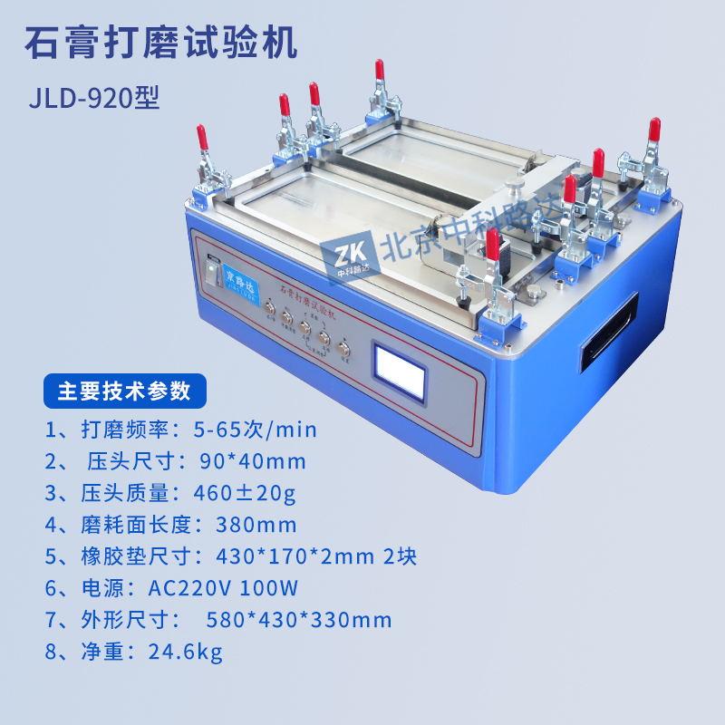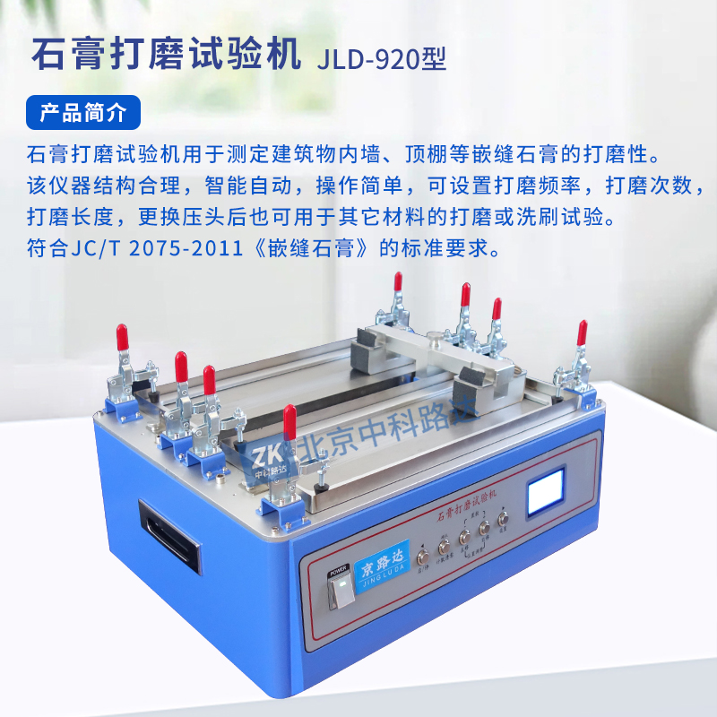 石膏打磨試驗機用于測定建筑物內墻、頂棚等嵌縫石膏的打磨性。該儀器結構合理,智能自動,操作簡單,可設置打磨頻率,打磨次數(shù),打磨長度,更換壓頭后也可用于其它材料的打磨或洗刷試驗。符合JC/T 2075-2011《嵌縫石膏》的標準要求。