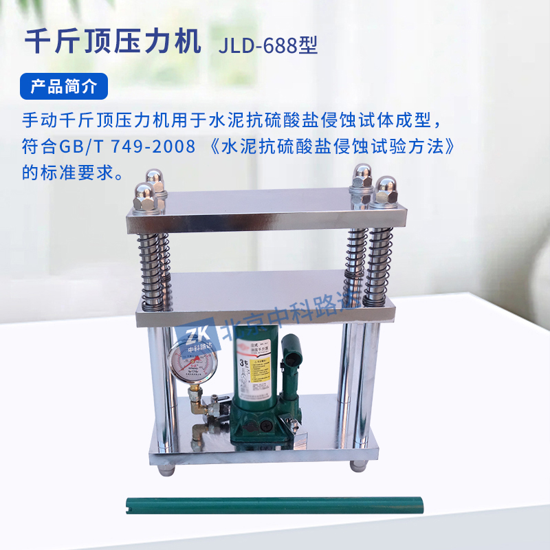 手動千斤頂壓力機用于水泥抗硫酸鹽侵蝕試體成型,符合GB/T 749-2008 《水泥抗硫酸鹽侵蝕試驗方法》的標準要求。