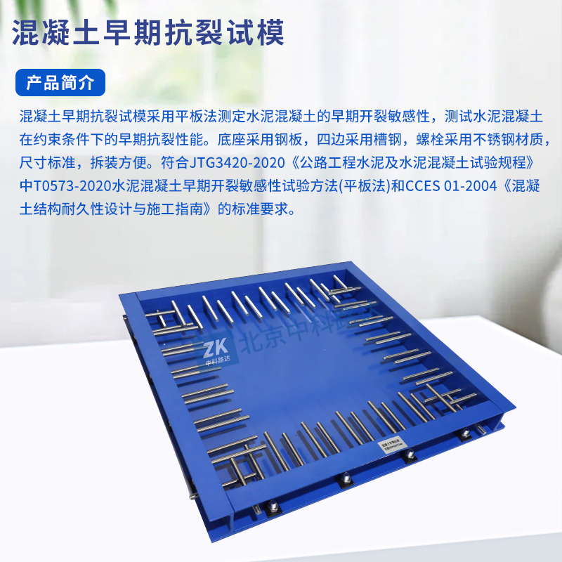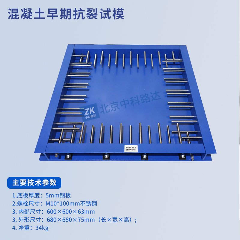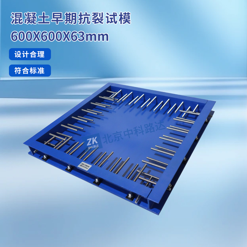 混凝土早期抗裂試模采用平板法測定水泥混凝土的早期開裂敏感性,測試水泥混凝土在約束條件下的早期抗裂性能。底座采用鋼板,四邊采用槽鋼,螺栓采用不銹鋼材質(zhì),尺寸標(biāo)準(zhǔn),拆裝方便。符合JTG3420-2020《公路工程水泥及水泥混凝土試驗(yàn)規(guī)程》中T0573-2020水泥混凝土早期開裂敏感性試驗(yàn)方法(平板法)和CCES 01-2004《混凝土結(jié)構(gòu)耐久性設(shè)計(jì)與施工指南》的標(biāo)準(zhǔn)要求。