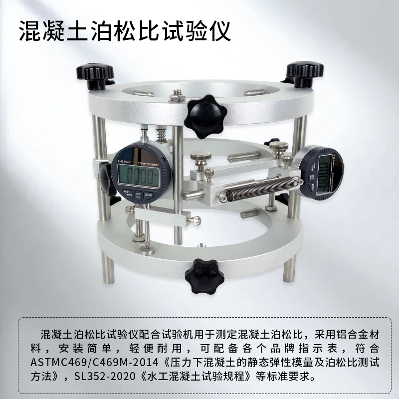 混凝土泊松比試驗儀配合試驗機用于測定混凝土泊松比,采用鋁合金材料,安裝簡單,輕便耐用,可配備各個品牌指示表,符合ASTMC469/C469M-2014《壓力下混凝土的靜態(tài)彈性模量及泊松比測試方法》,SL352-2020《水工混凝土試驗規(guī)程》等標準要求。