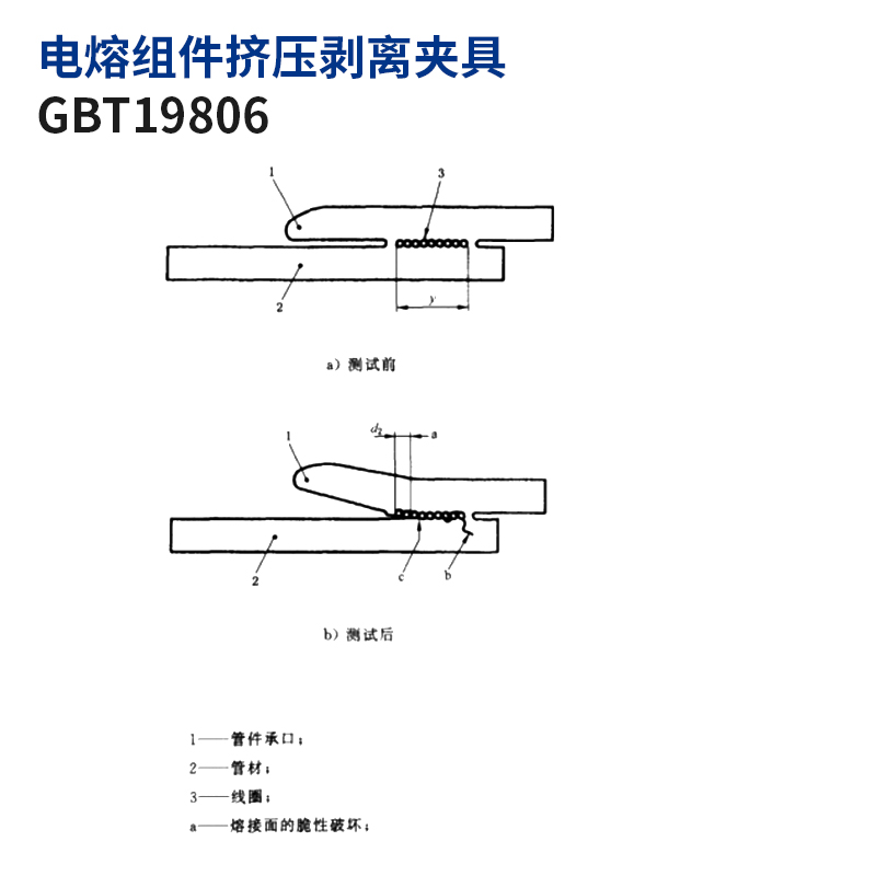 電熔組件擠壓剝離夾具用擠壓的方法來確定流體輸送用聚乙烯管材和電熔承口或鞍形管件組件的抗剝離性能。試驗是通過擠壓測試試樣來評估PE管材/電熔承口或鞍形管件之組件的熔接質量。符合GB/T 19806-2005《塑料管材和管件 聚乙烯電熔組件的擠壓剝離試驗》的標準要求。
