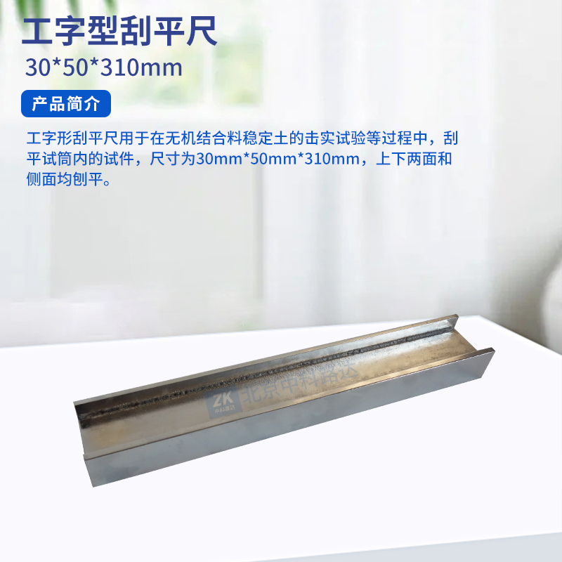 工字形刮平尺用于在無機結合料穩定土的擊實試驗等過程中,刮平試筒內的試件,尺寸為:30mm*50mm*310mm,上下兩面和側面均刨平。