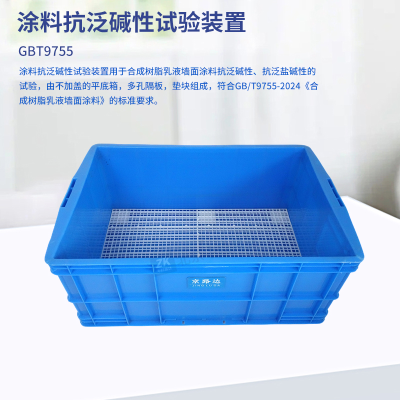 涂料抗泛堿性試驗裝置用于合成樹脂乳液墻面涂料抗泛堿性、抗泛鹽堿性的試驗,由不加蓋的平底箱,多孔隔板,墊塊組成,符合GB/T9755-2024《合成樹脂乳液墻面涂料》的標準要求。